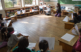 このような子どもたちが「文学」「音楽」「美術」「体育」「身体表現」という世界の中で、朗読や合唱、絵画など体と心が一体となった芸術表現をすることで、「表現することの楽しさ」「表現することの感動」を体験し、「自分の体と心を開き」「自分を見つめ」「新たな自分とめぐり合い」「他者とつながり」「より良く生きようとする力」を強くしていく場として、柿の木坂芸術学校は存在します。